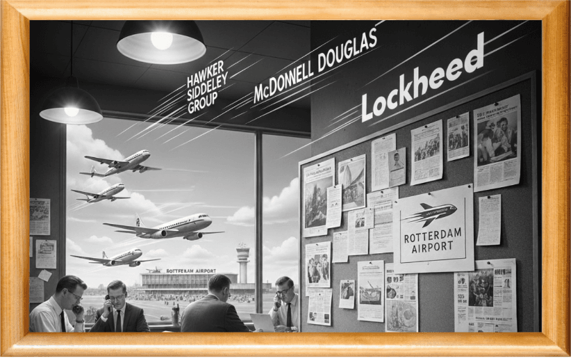Bedrijven in Amerika en Engeland waren eerder bezig met PR dan in Nederland. Het was Kick van Hulzen die als eerste met zijn eigen PR-bureau dit onbekende terrein betrad. Dat deed hij in eerste instantie ook voor bedrijven uit Amerika en Engeland uit de luchtvaartindustrie. Het begon allemaal met de Britse vliegtuigfabrikant Hawker Siddeley Group. Niet veel later volgenden twee Amerikaanse vliegtuigfabrikanten: McDonnel Douglas en Lockheed (over deze laatste lees je binnenkort nog meer). Ook de luchtvaartbranche in ons eigen land kreeg lucht van de PR-diensten van Van Hulzen. Zo werd Martin Air klant en verzorgenden we de complete bewegwijzering voor Rotterdam Airport, inclusief het ontwerp van hun logo. Je kan gerust zeggen dat ons bureau met de eerste klanten een vliegende start maakte!